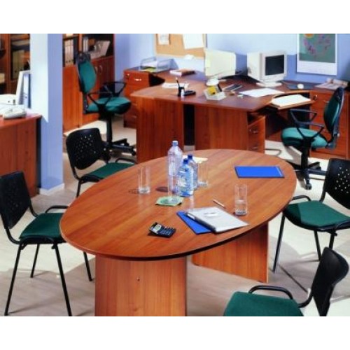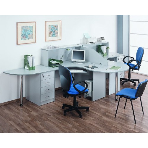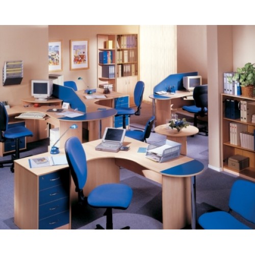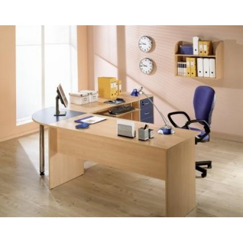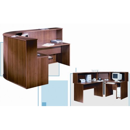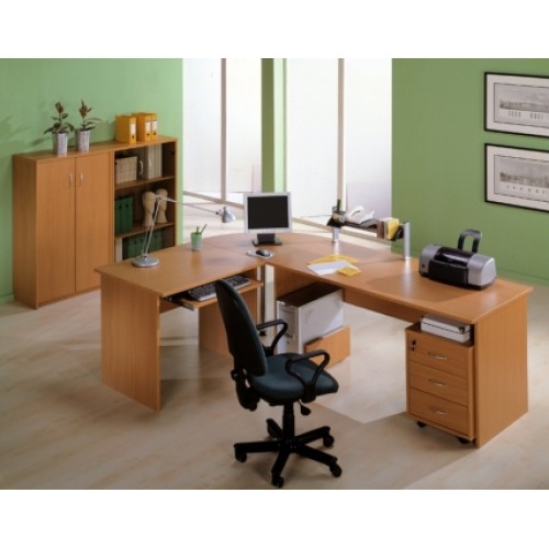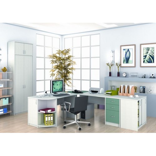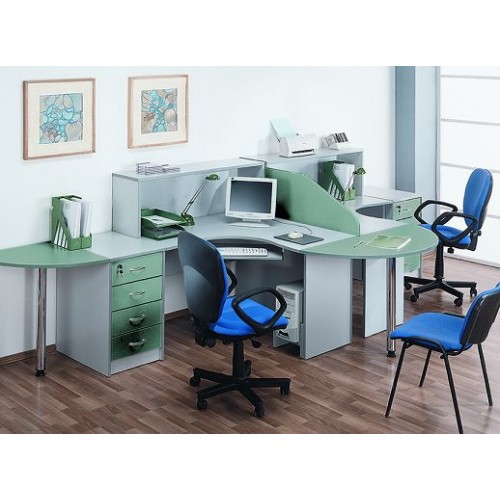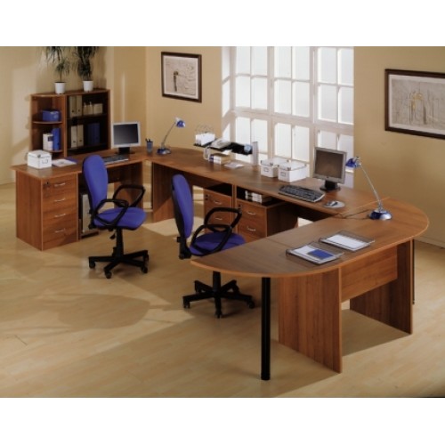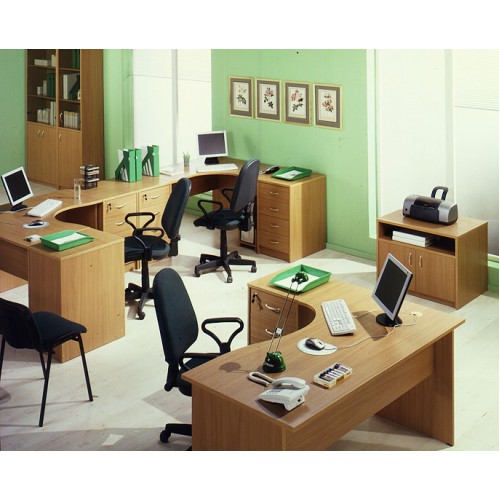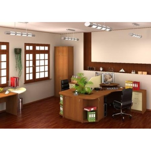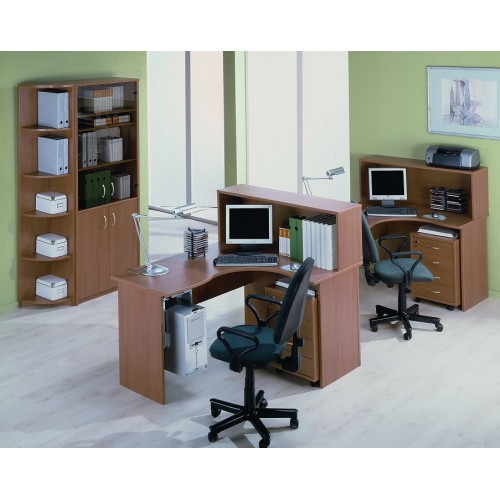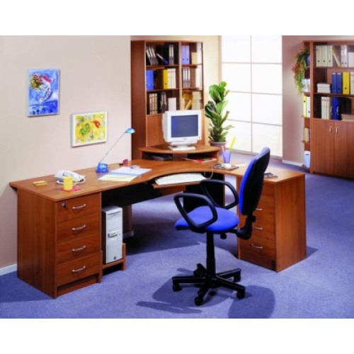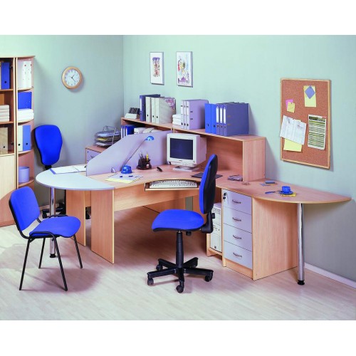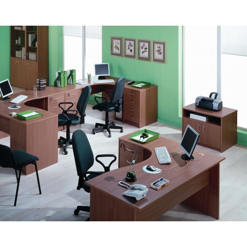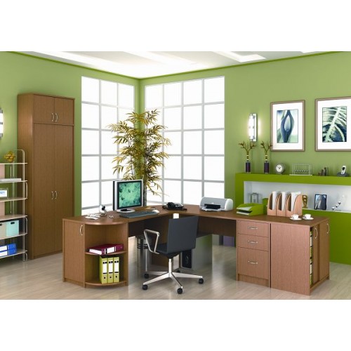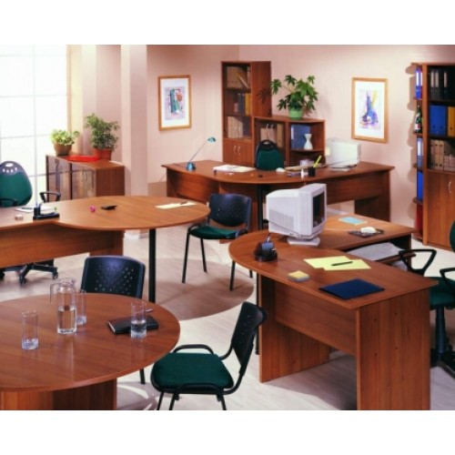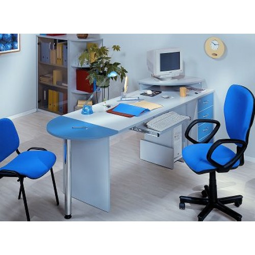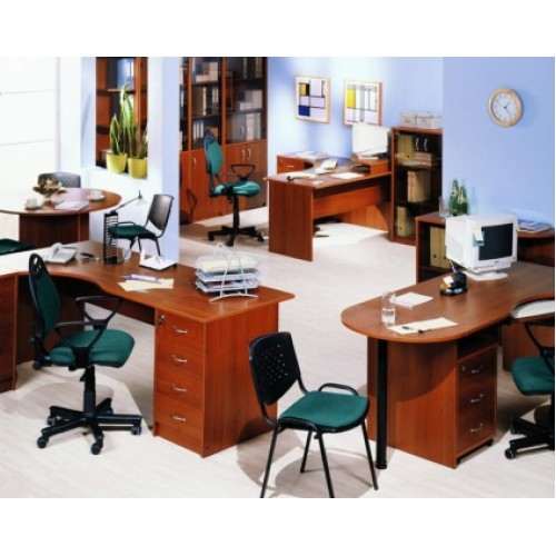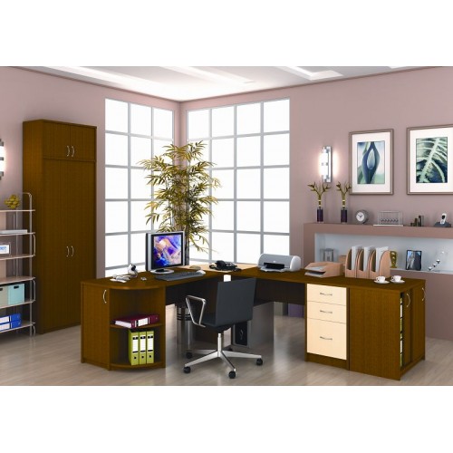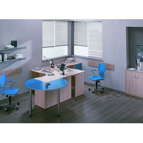 Исполнение: "Орех", "Бук", "Груша арозо", "Серый", "Синий" - дополнительный. Столешницы, боковые опоры столов, приставки, надставки, топы и каркасы шкафов изготовлены из ЛДСП толщиной 22 мм. Все торцевые поверхности столов, шкафов, тумб защищены противоударной кромкой ПВХ толщиной 2 мм производства фирмы Rehau (Германия). Экраны, накладки ящиков тумб, двери шкафов изготовлены из ЛДСП толщиной 18 мм. Приставки, накладки ящиков тумб, экраны могут быть выполнены в дополнительном цвете.